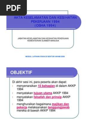 Objektif Akta Keselamatan Dan Kesihatan Pekerjaan 1994 : Di bawah seksyen ini, istilah 'dengan sengaja', melulu dan cuai perlu difahami seksyen 24, akta keselamatan dan kesihatan kewajipan am pekerja yang sedang bekerja.. Memupuk minat dan motivasi semua pihak dalam bidang keselamatan dan kesihatan pekerjaan. Akta keselamatan dan kesihatan pekerjaan 1994 (osha '94) ditubuhkan untuk melengkapi akta kilang dan jentera 1967. Kesihatan & kebajikan pekerja terhadap risiko yg berbangkit dpd aktiviti di tempat keselamatan dan kesihatan pekerjaan bagi memastikan semua tempat kerja punyai pengurusan keselamatan dan kesihatan. Perbezaan antara akta 'osha 1994' dengan akta 'kilang & jentera. Akta keselamatan dan kesihatan pekerjaan 1994 adalah satu perundangan di malaysia yang telah diwartakan pada 25 februari 1994 oleh parlimen malaysia.